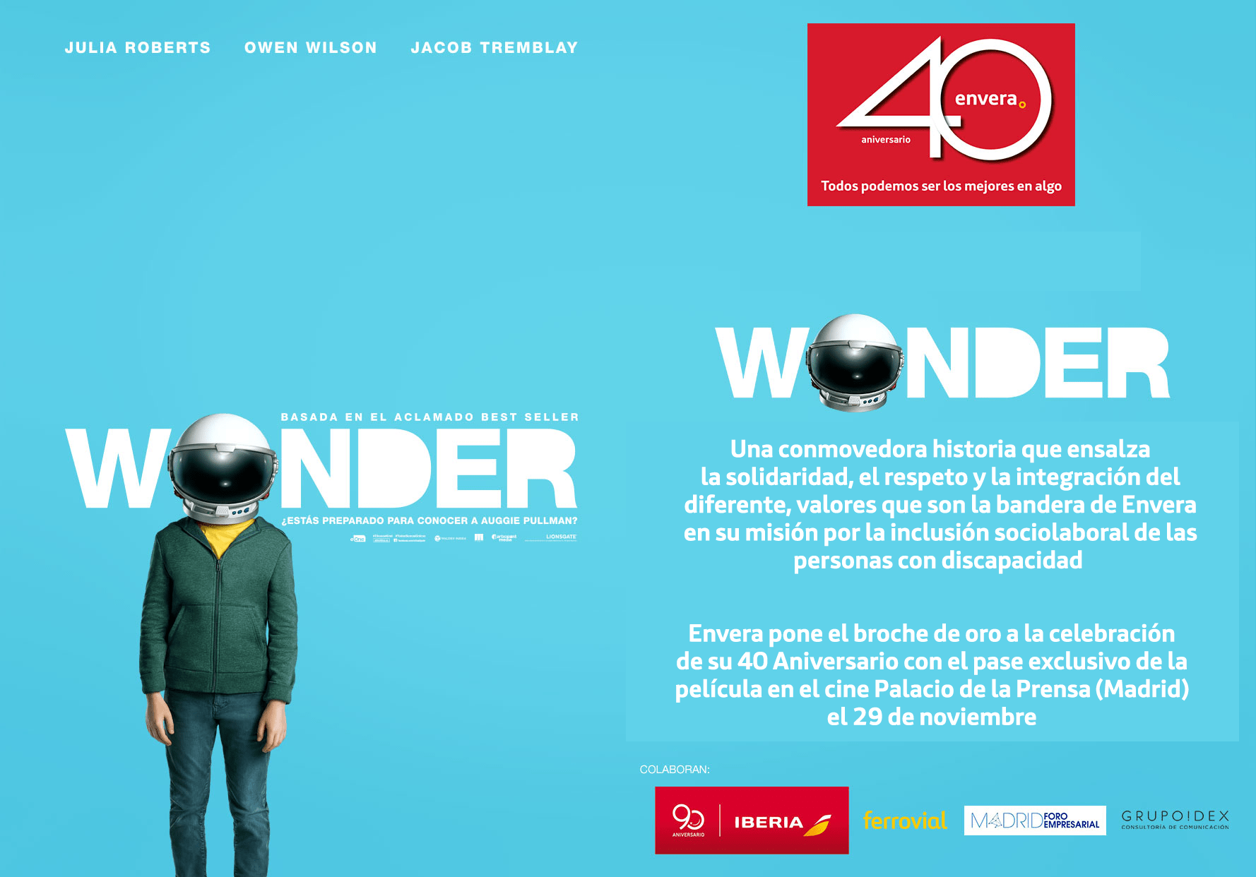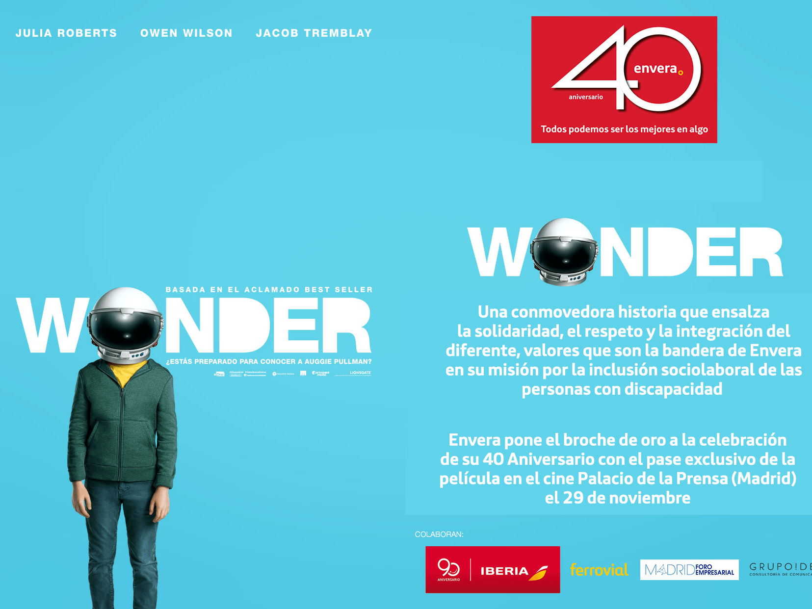 Envera, organización dedicada a la atención de las personas con discapacidad intelectual a lo largo de toda su vida, pondrá el broche de oro a la celebración de su 40 aniversario con el pase exclusivo de la película Wonder, el próximo 29 de noviembre en el cine Palacio de la Prensa de Madrid, gracias al apoyo de eOne, distribuidora de la película.