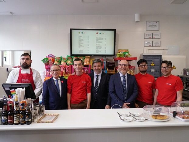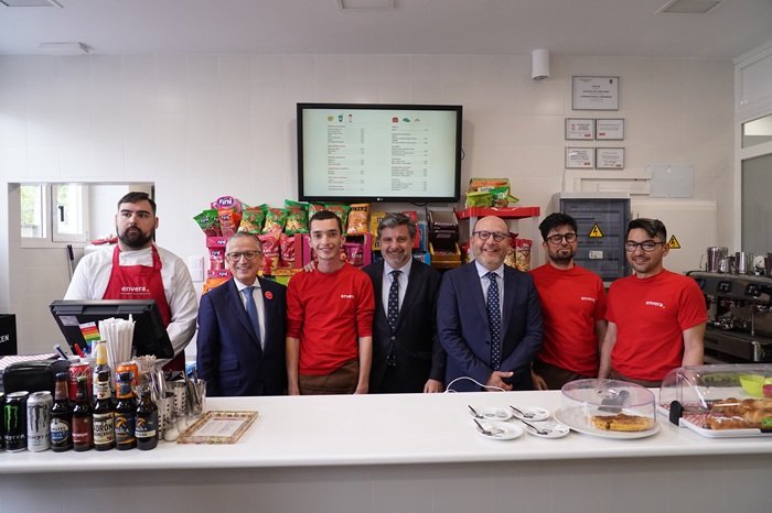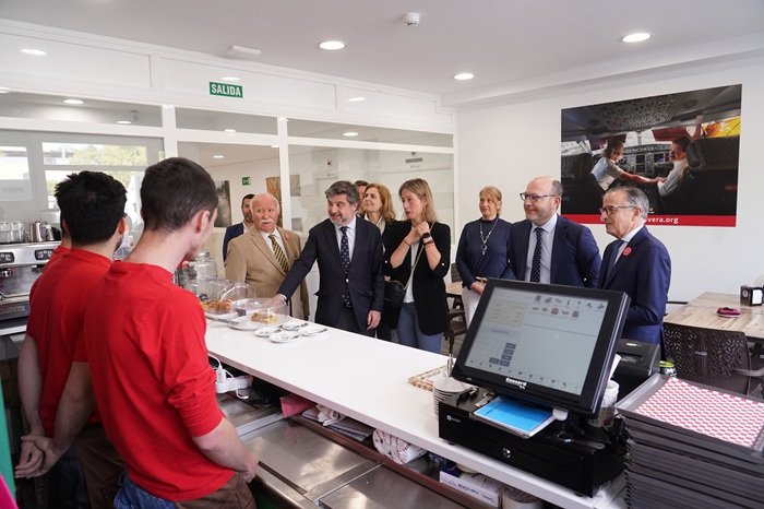 El delegado de Políticas Sociales, Familia e Igualdad del Ayuntamiento de Madrid, José Fernández, y el presidente de la Junta Municipal de Barajas, Juan Peña, han inaugurado esta mañana Envera Gastro, la primera cafetería gestionada por personas con discapacidad en una instalación municipal de Madrid.
