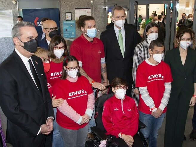 Los Reyes Felipe VI y Letizia han saludado a las personas con discapacidad de Envera durante la inauguración oficial de Fitur y han dado la enhorabuena a la entidad sin ánimo de lucro por la labor social que realiza desde su nacimiento en 1977, en el seno de la compañía Iberia, con el objetivo de que las personas con discapacidad intelectual ocupen con dignidad su lugar en el mundo.