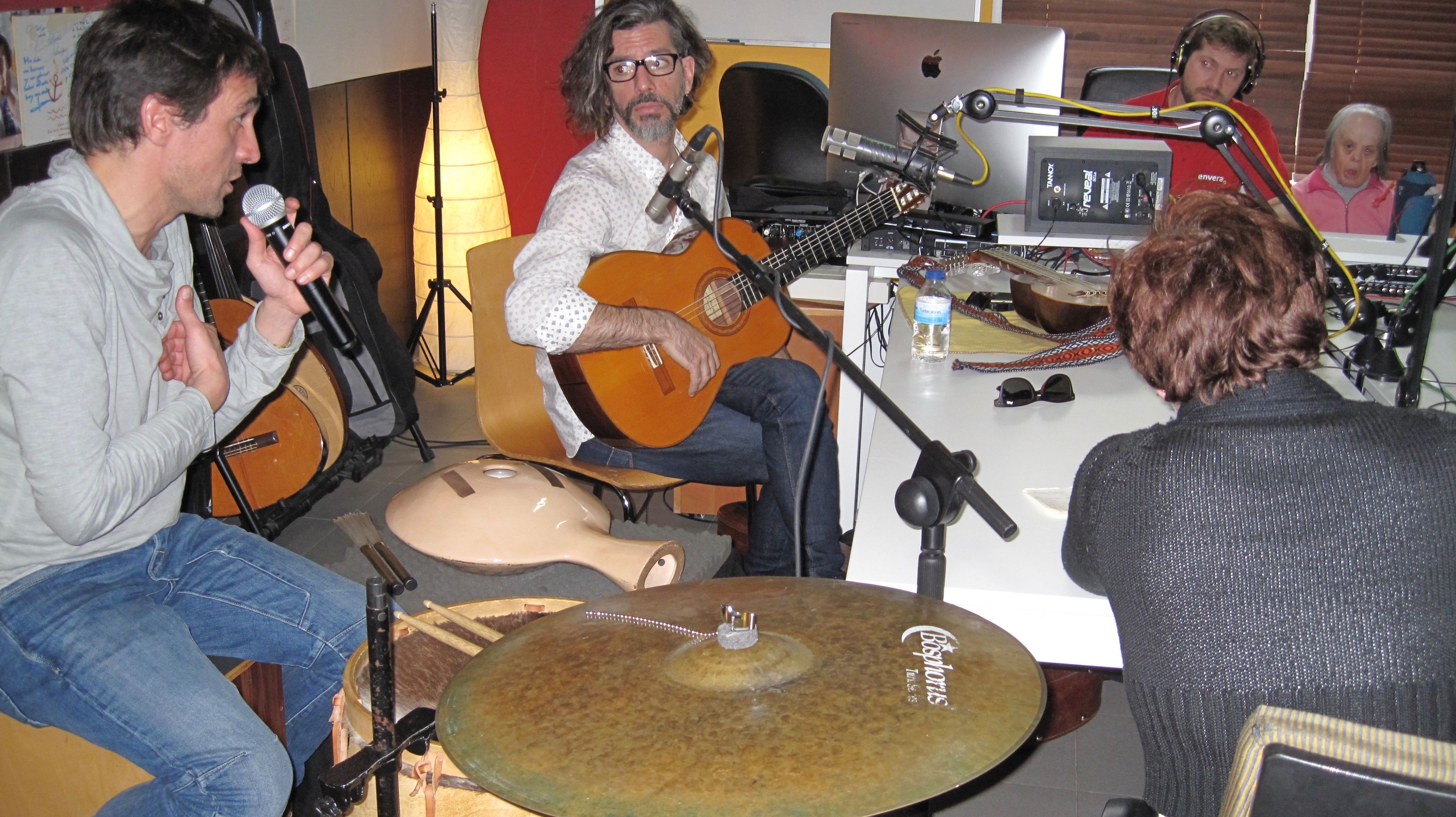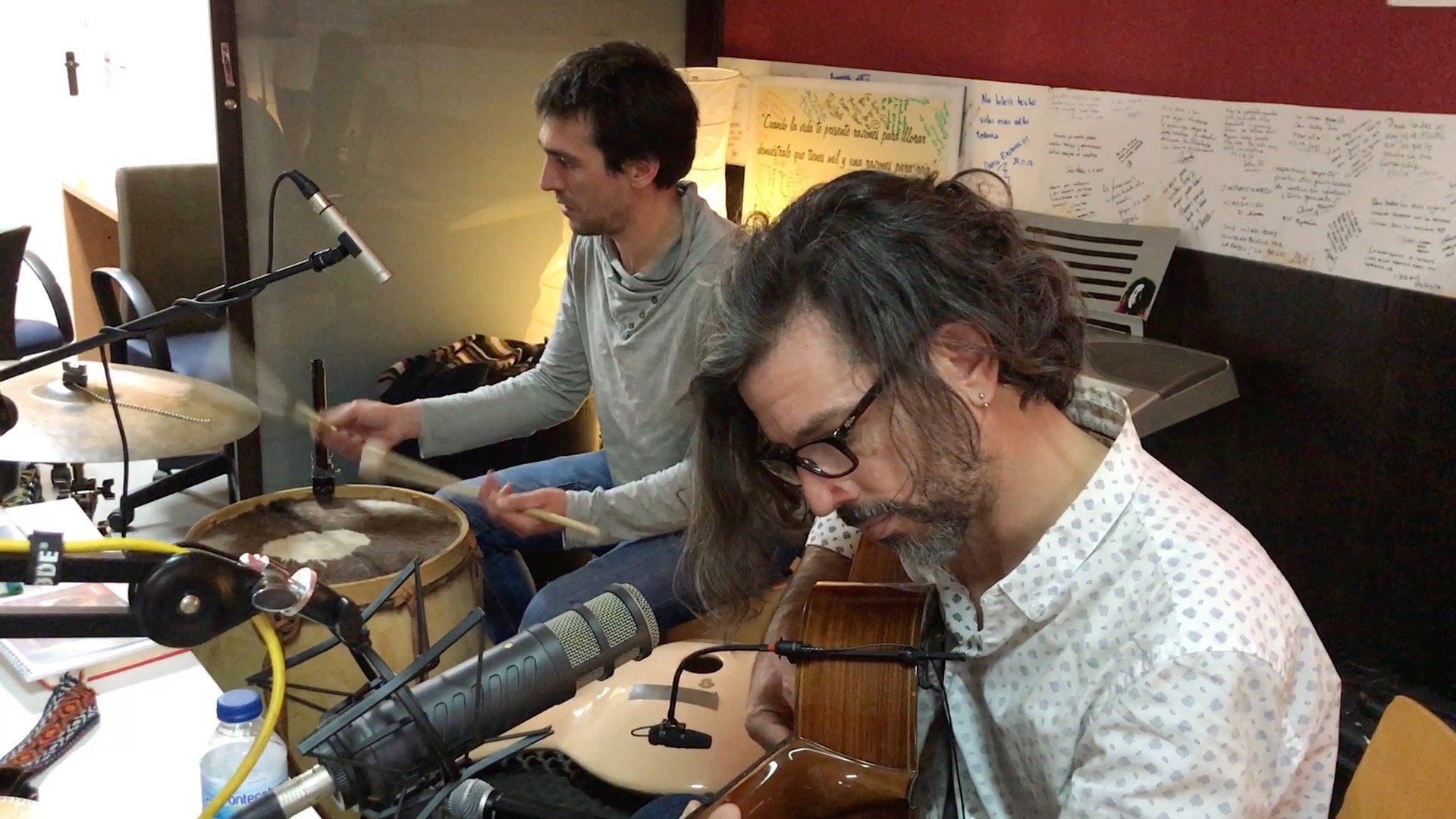 Hace años quedó pendiente la visita de ambos y como el tiempo es más fugaz que el latido de una perdiz, ha tenido que llover mucho desde entonces. Una coincidencia y la buena voluntad, han bastado para tenerlos aquí acompañados con alguno de sus instrumentos: Jesús, con su bombo leguero, el polivalente cajón, su melódica, la tinaja ancestral y un ride de lujo; Manuel tampoco estaba sólo, una de sus maravillosas guitarras españolas de luthier y un charangón, o ronroco, artesanal y precioso, con los que inundaron el aire de ritmos, melodías y armonías propias de otras tierras hermanas.