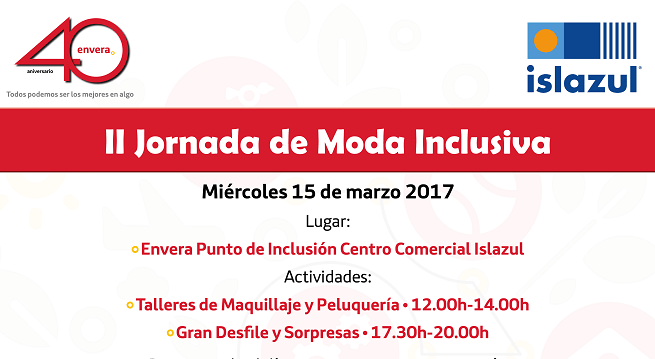 El Centro Comercial Islazul, en su dedicación por colaborar en acciones que fomenten la inclusión de las personas con discapacidad, acogerá el próximo miércoles 15 de marzo la II Jornada de Moda Inclusiva, organizada por Envera, entidad sin ánimo de lucro cuya misión es la integración socio-laboral de las personas con discapacidad y que este año celebra su 40 aniversario bajo la presidencia de honor de Su Majestad la Reina Doña Letizia.