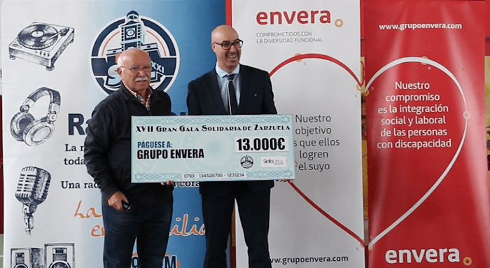 Juan Manuel Gómez, Director de Radio Sol, ha hecho entrega al Presidente de Envera, José Antonio Quintero, de un cheque de 13.000 euros que representa la taquilla solidaria de la XVII Gran Gala de Zarzuela de Año Nuevo, organizada por la emisora madrileña y la Fundación Sinfolírica y que consiguió llenar el pasado enero el Auditorio Nacional, a favor de Envera.