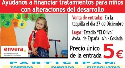 El Ayuntamiento de Coslada y Grupo Envera – Asociación de Empleados de Iberia Padres de El Ayuntamiento de Coslada y Grupo Envera – Asociación de Empleados de Iberia Padres de Personas con Discapacidad, en colaboración con Sergio Marín, organizan este domingo 27 de diciembre un partido de fútbol solidario a iniciativa de la Asociación desafío Mógena con el fin de conseguir financiación para los Programas de atención temprana que Grupo Envera desarrolla para niños de entre 0 y 6 años con discapacidad y alteraciones en el desarrollo.