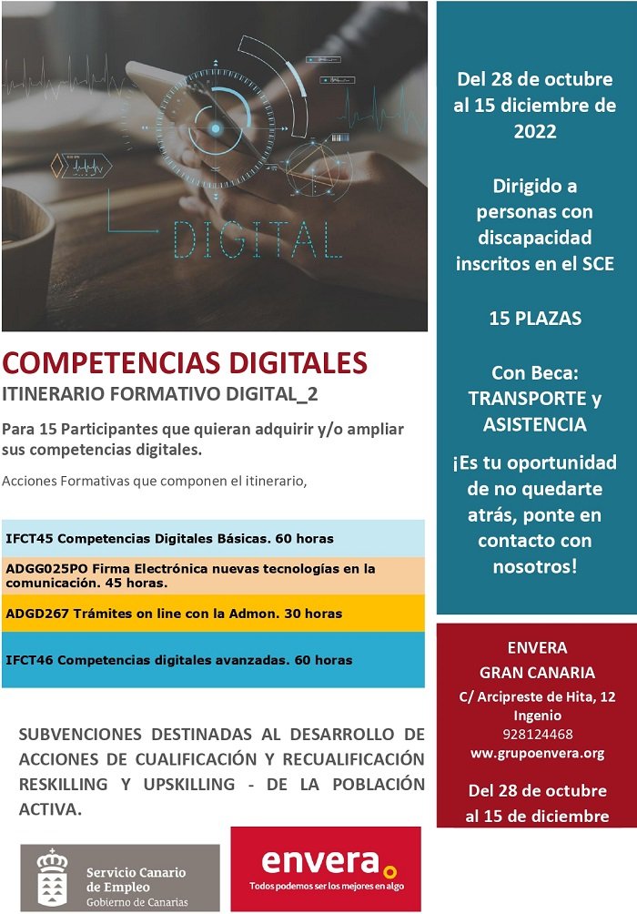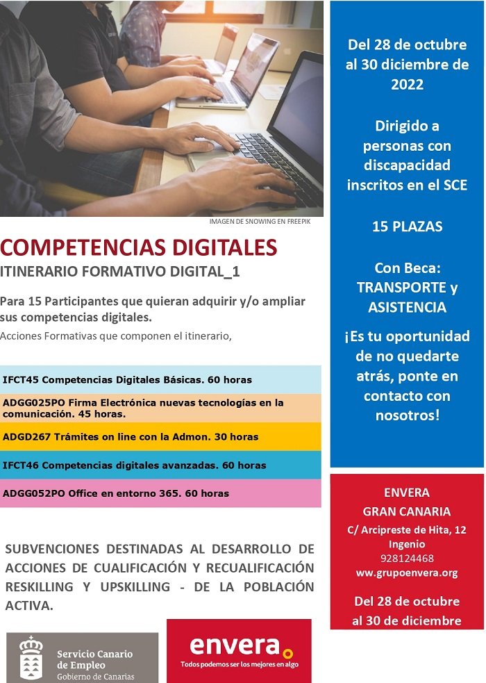 La sede de Envera en Gran Canaria ha lanzado la convocatoria de dos itinerarios formativos en competencias digitales para personas con discapacidad, inscritas en el Servicio Canario de Empleo y que quieran actualizar sus conocimientos y habilidades en el uso de herramientas tecnológicas como Internet. Las formaciones son gratuitas y cuentan también con beca de transporte y asistencia.